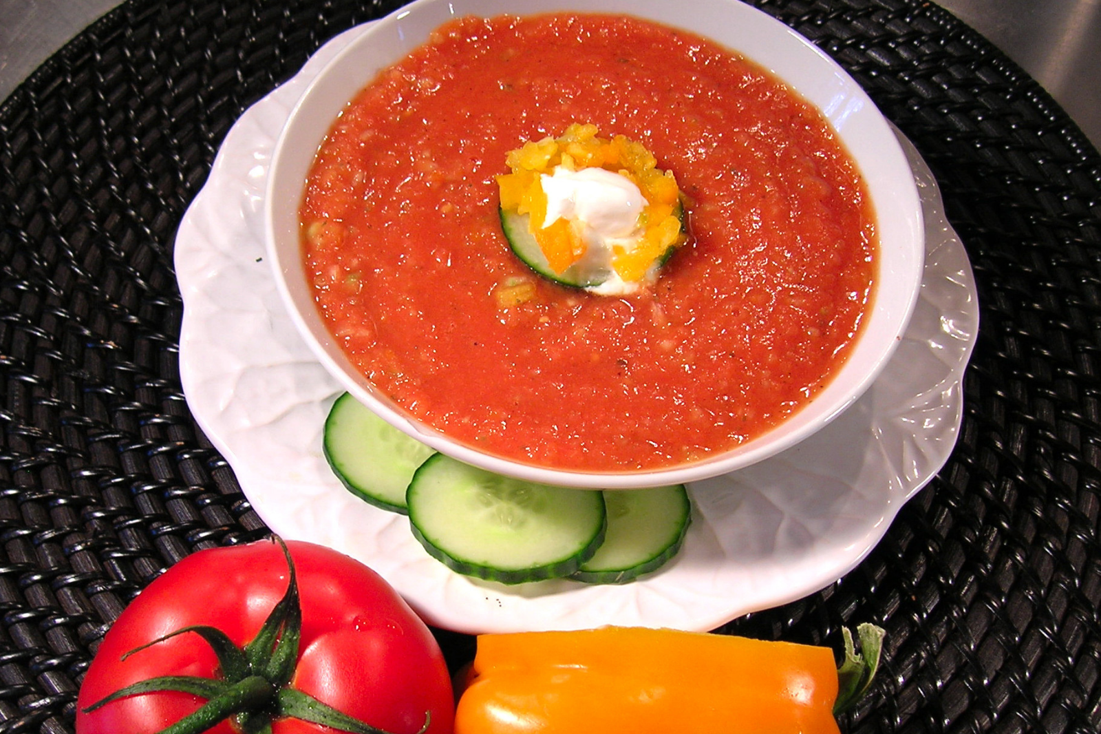 This is a wonderfully easy soup to prepare. No stove and no oven. It originated in Andalusia, Spain hundreds of years ago when olive oil and vinegars came into fashion. It was originally created as a way to use up stale bread (waste not, want not) but this recipe replaces the high carbohydrates of bread with wonderful chunky vegetables.