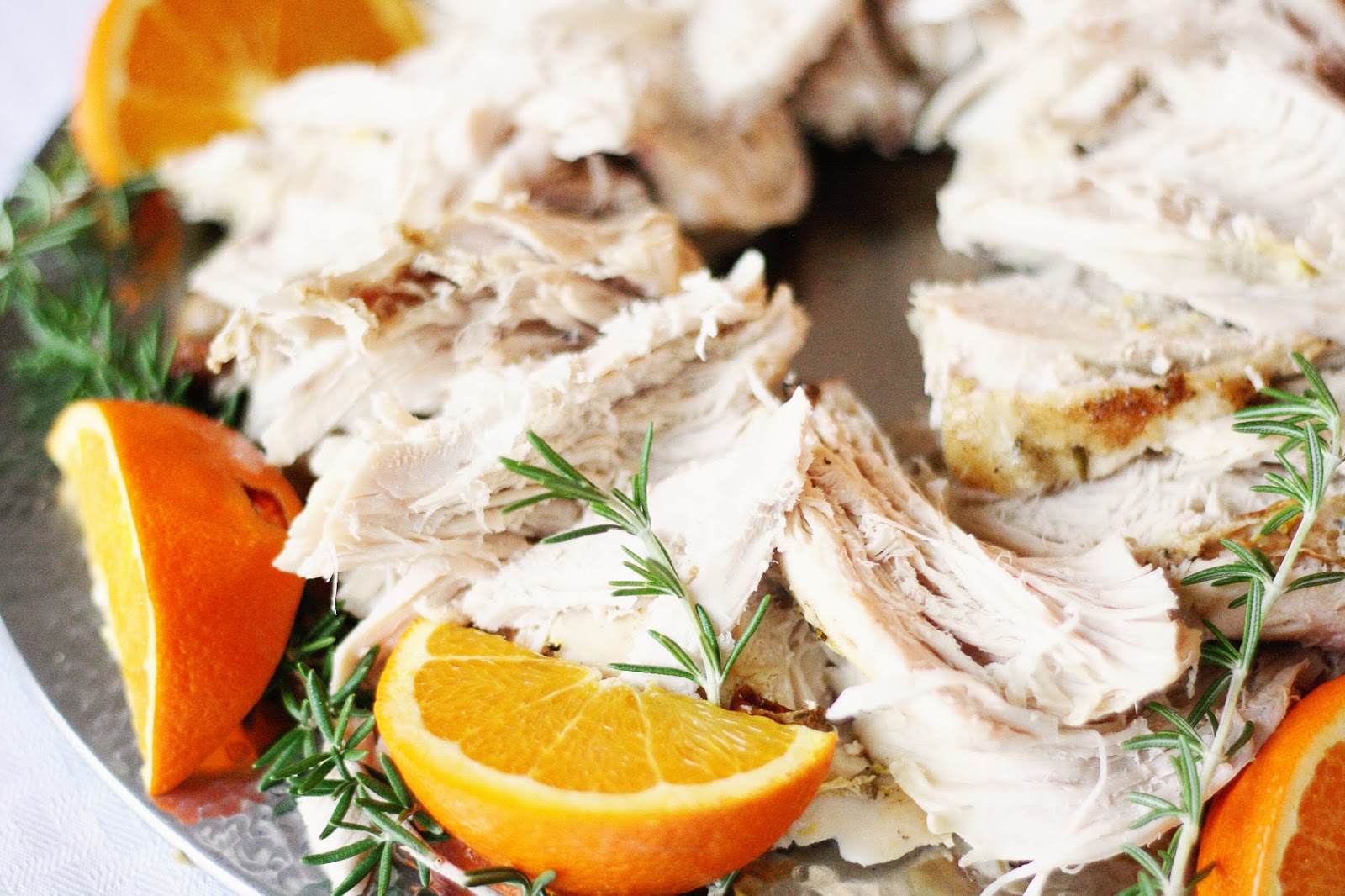 - Mix the olive oil, garlic, rosemary, parsley, thyme, pepper and salt. Rub all over the outside of the turkey and then gently lift the skin, being careful not to tear it, and rub under the skin.